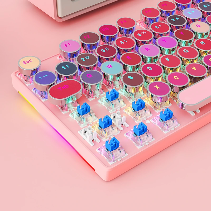 HUO JI Mekanik Oyun Klavyesi Daktilo Tarzı, RGB Yan Aydınlatmalı ve Gökkuşağı Arkadan Aydınlatmalı Retro Tarzı Mavi Anahtarlar 104 Tuşlar Pembe
