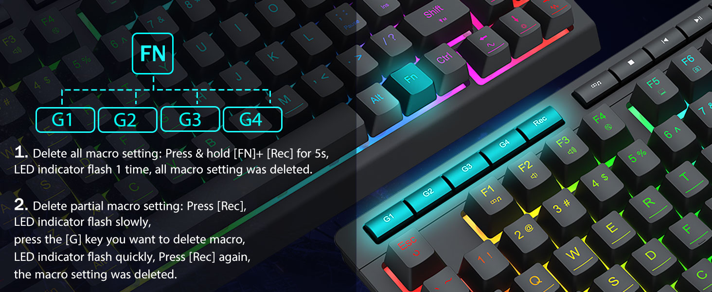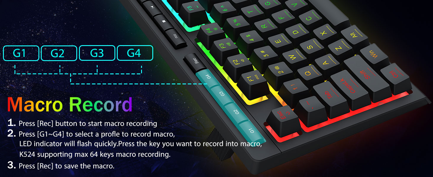 4 Yerleşik Makro Tuşu -4 yerleşik makro tuşu (G1~G4) programlanabilir ve herhangi bir ek yazılım gerektirmeden anında çalışır. Tuşların düzenlenmesi kolaydır ve çeşitli farklı makroları gerçekleştirebilir.
