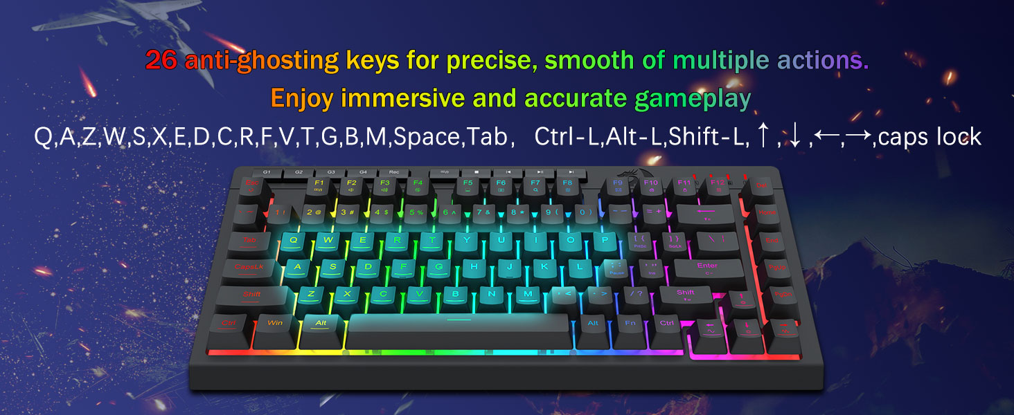 26 Hayalet Karşıtı Tuş ve Özel Medya Kontrolleri -İstediğiniz şekilde hızlı ve doğru oyun yanıtları vermek için 26 tuşun aynı anda çalışmasına olanak tanıyan gölgelenme önleyici tuşlara (alt çizgi içeren tuşlar) sahiptir. Özel medya kontrolleri, multimedyayı doğrudan klavyeden oynatmanıza, duraklatmanıza ve atlamanıza olanak tanır, böylece oyununuz sorunsuz ve kesintisiz olur.