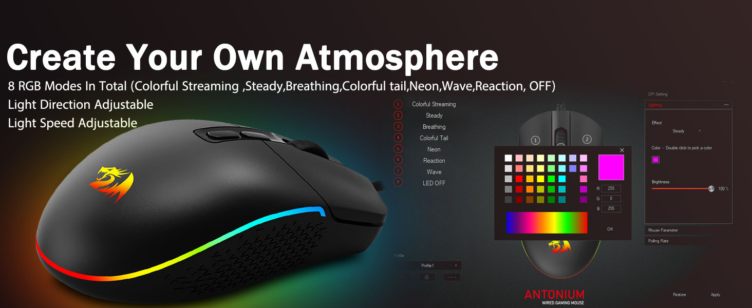 8 İyi RGB Arkadan Aydınlatma Modu- Arka ışığı açın ve oyun savaş alanınızda birkaç öldürme yapın. Heyecan verici dinamik RGB arkadan aydınlatmalı havası, oyun alanınızı dekore ederken sizi asla yarı yolda bırakmaz; ışıklar açıkken diğer Redragon aksesuarlarıyla daha iyi olur.