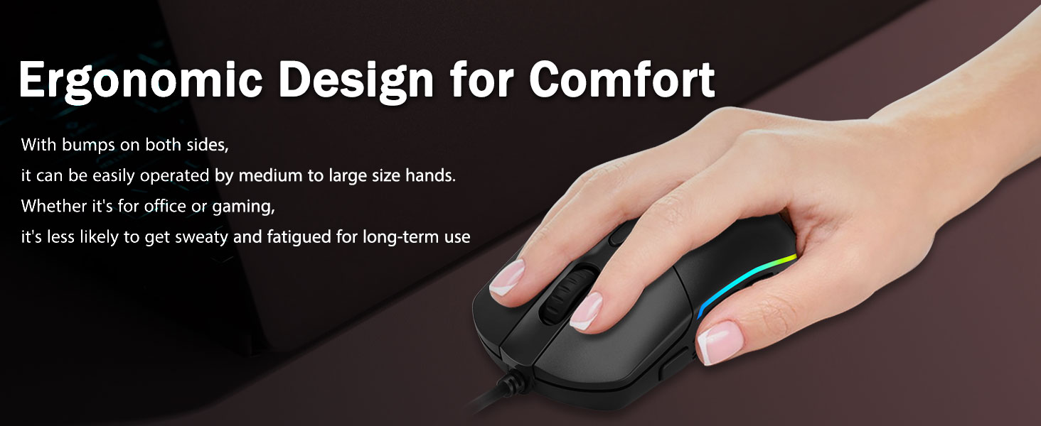 Konforlu Tutuş- Her iki taraftaki ergonomik çıkıntılar, oyun farelerinin her ele sığmasını sağlar. Uzun saatler süren yoğun oyunlarda bile oyunculara yorulmadan uzun süreli konfor sağlar. Oyun faresini kaldırırken veya hızlı ve hassas kaydırmalar yaparken kaymaz.