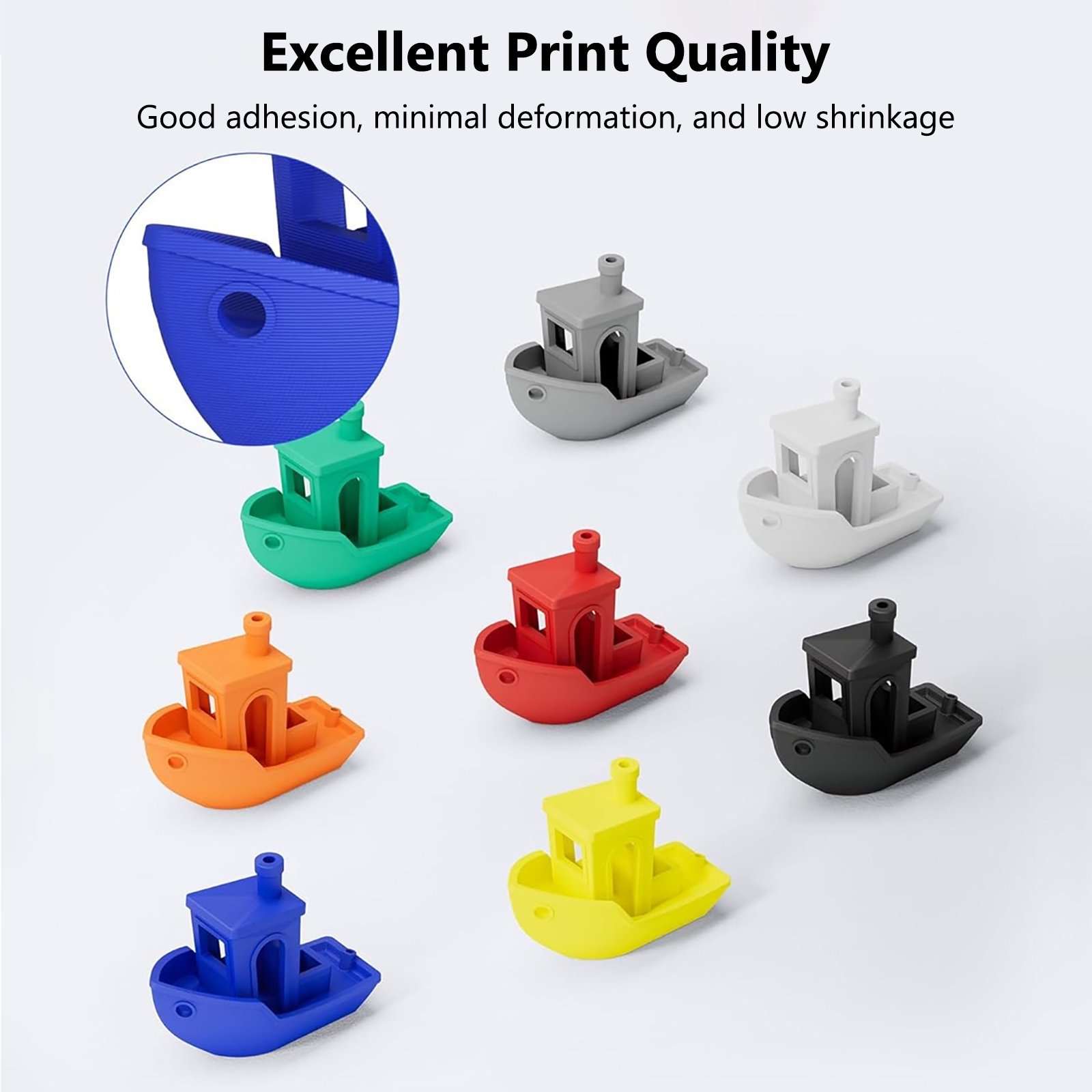 PLA diğer termoplastiklere kıyasla nispeten düşük termal büzülmeye sahiptir. Sonuç olarak, Beyaz PLA 3D Yazıcı Filamenti PLA Filamenti 1,75 mm, ısıtmalı bir yapı odası olmadan bile minimum bükülme ile baskı yapar.